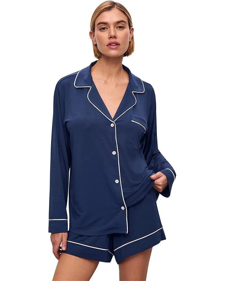 - Feel beautiful and enjoy luxurious comfort wearing the Eberjey® Gisele Long Sleeve Top & Short PJ Set. Crafted from a temperature-regulating knit fabric, the relaxed long sleeves give you more coverage up top, while leg-baring sleep shorts let you sleep cool all night long. The collared top features a patch pocket on the left chest, a full-button closure, and contrast piping. The matching pull-on shorts feature an elasticated waistband, cuffs at the hem, and contrast piping.