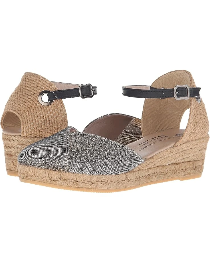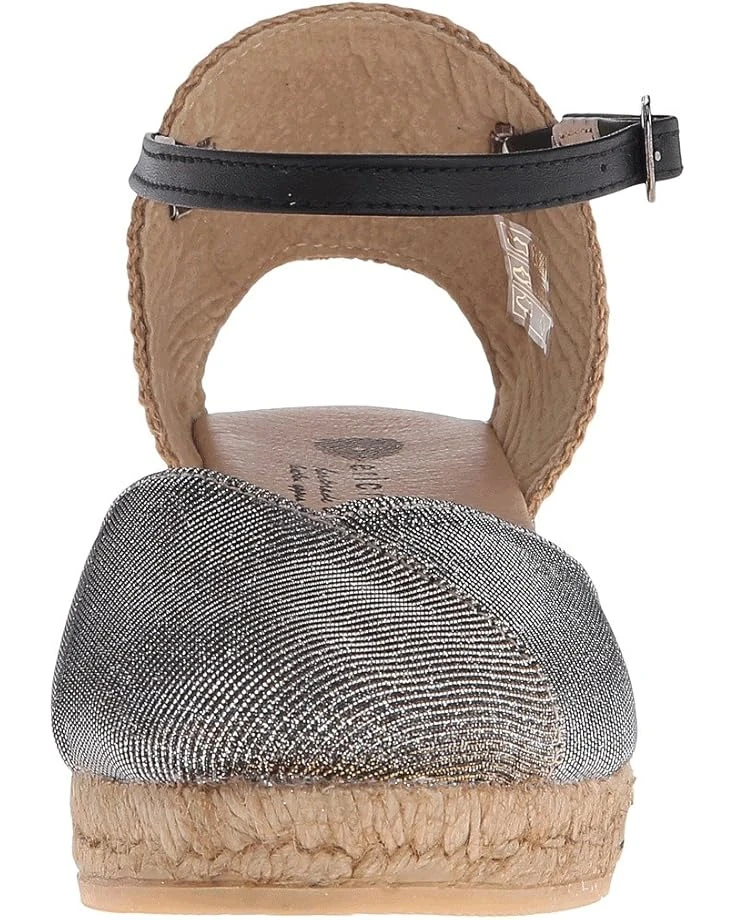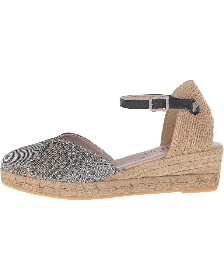 I love love love these shoes! I was looking for a closed-toe espadrille with a low heel. These fit the bill. They are a bit more sparkley than they appear in the photo, but it adds some “fun”.