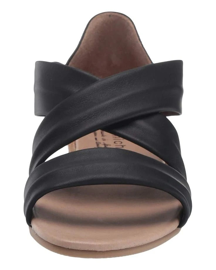 This is such a disappointment because the sandal, with a little wedge and an updated style in a great color is just not the right last for my foot being too narrow across the front. Maybe Erich Michael company will bring this same shoe out again, in a variety of colors, but widen the front just a tad. The soft leather strap across the toes will probably stretch with wear, but my foot would not be confined to the sole.